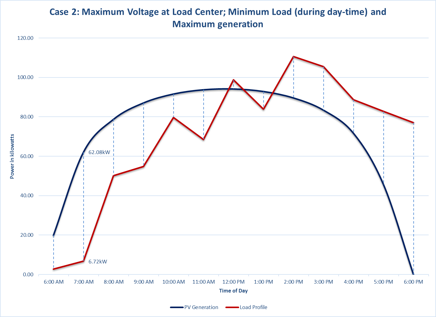 Case 2: Maximum voltage at load center, low voltage side; minimum load (during day-time), and maximum generation.